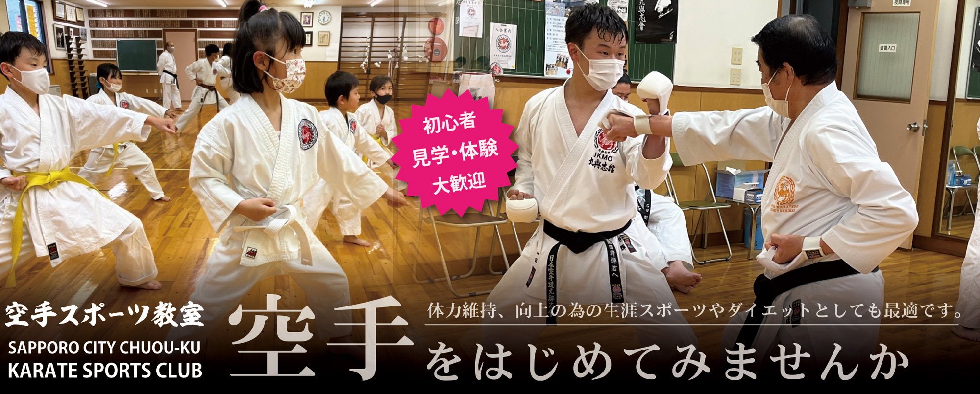 中央区空手スポーツ教室は札幌でも50年程の歴史があり最も古い空手道場の一つです。空手は敷居が高いと思われがちで 「稽古が厳しそう…、怖い…、痛そう…」などとイメージされる方もいるかもしれません。丸與志館は、日本でも 一番会員数が多い「松濤館流空手道」という伝統派空手の流派に属しています。フルコンタクト系の空手とは異なり 伝統派空手はノンコンタクトであり、専用の防具を付け「寸止め」でという方法で組手を行いますので、直接相手に 打撃を与えることはありません。またオリンピック競技でもある「形(かた)」も稽古の重要な一つとして空手の 伝統の技を学びます。このように直接打撃を与えず、形においても全身使う空手は健康なスポーツとして、日頃の 運動不足の解消や、ダイエット、世代を超えてお孫さんからおじいちゃんまでご家族をできる生涯スポーツとしても 近年注目されています。 みなさんもぜひ、心と体を健全に保ち、日々健やかな生活を送るために空手を健康的な スポーツとして、一緒に楽しく汗を流しませんか? 空手はどなたでも、何歳からでも始められます。