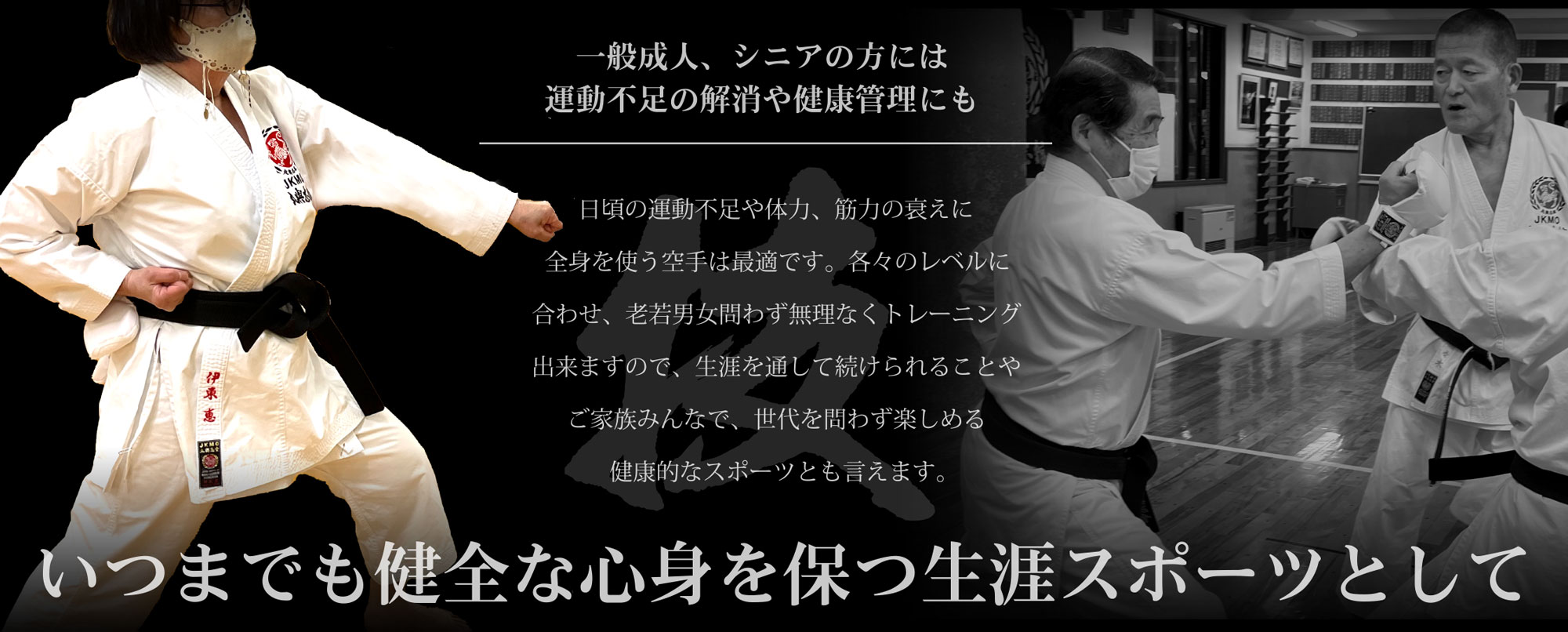 日頃の運動不足や筋力体力の衰えに全身を使う空手は最適なスポーツです。各自のレベルや体力に合わせ 老若男女問わず、無理なくトレーニングをすることが出来ます。年齢を経てもご自分のペースでできる空手は 生涯スポーツとしても見直されています。一般会員の方は大人になってから始められた方がほとんどで、70代の 方も元気に稽古に励んでいらっしゃいます。初めての方には専門のインストラクターが親切丁寧にご指導致します。